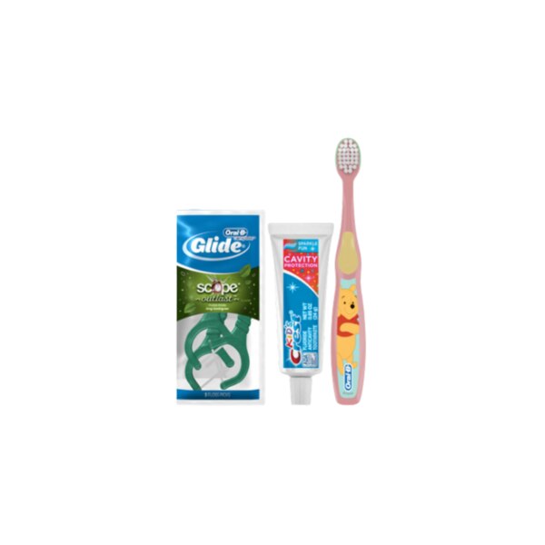 Oral-B® Kids Toothbrush in Disney Pooh character graphics; Kids Crest® Cavity Protection Sparkle Fun flavor Toothpaste (.85 oz); Oral-B® Glide™ + Scope Floss Picks (3ct); FREE Patient Sample Bags.