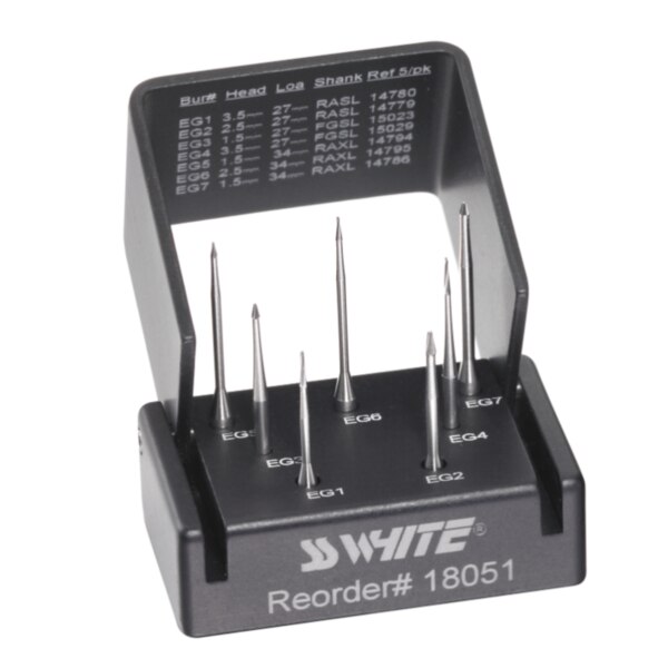 Efficient, straight-line access to canals is achievable with EndoGuide , a unique set of eight carbide burs for non-surgical root canal treatment. The patented, conical shaped micro-diameter tip acts as a self-centering guide for precision access to canals while conserving healthy peri-cervical dentin. The funnel-shaped bur design improves canal visualization.
