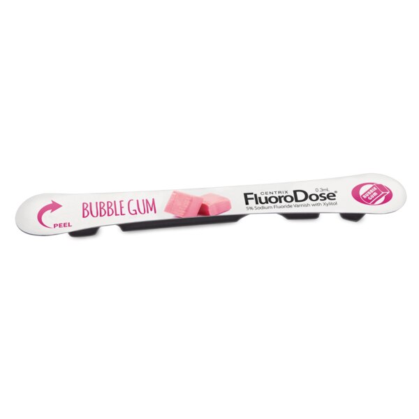 FluoroDose contains 5% sodium fluoride (NaF) or 22,600 ppm of fluoride. Each unit contains one single dose (0.3 mL) of FluoroDose plus one Benda® Brush applicator. Simply peel back the cover, dip in the brush, mix and apply. Centrix makes fluoride varnish safer and cleanup easier.