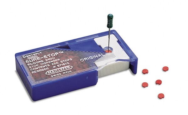 Provides safe and easy placement of pre-notched silicone stops. Each holds 200 1.5 mm thick silicone stops. Available in red yellow blue or black.